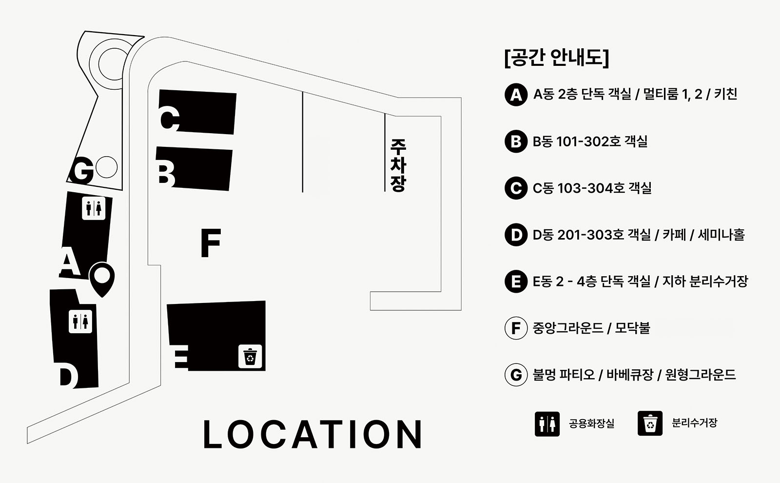 쓰레기는 E동 앞 분리수거장에 배출해주세요.